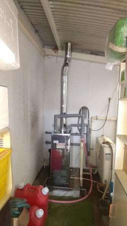 既存給湯器を撤去して配管工事、エントツ調整を行いオイルタンクと同タイプのボイラーを設置しました。 |